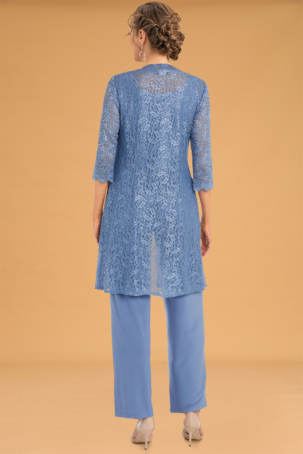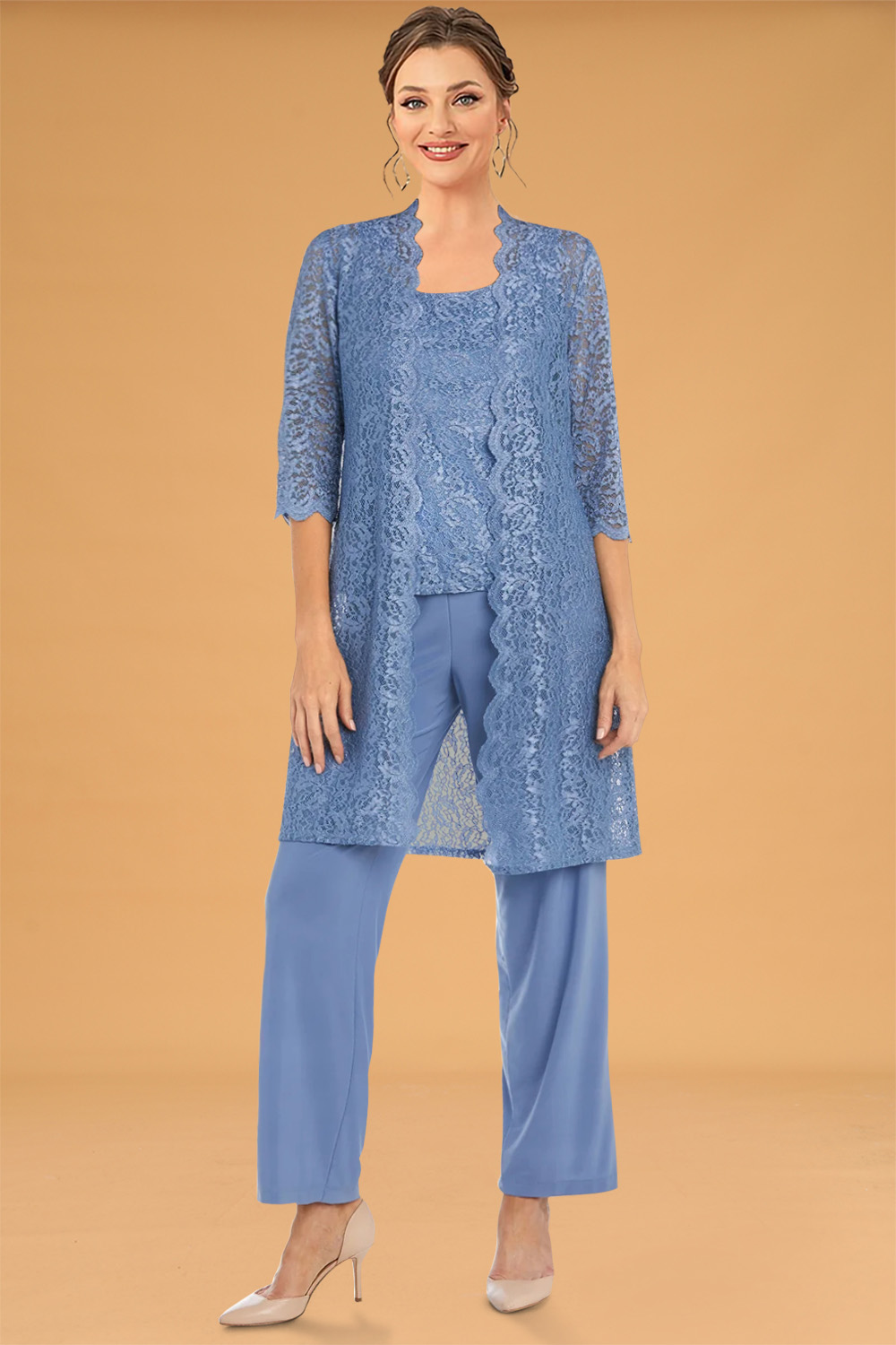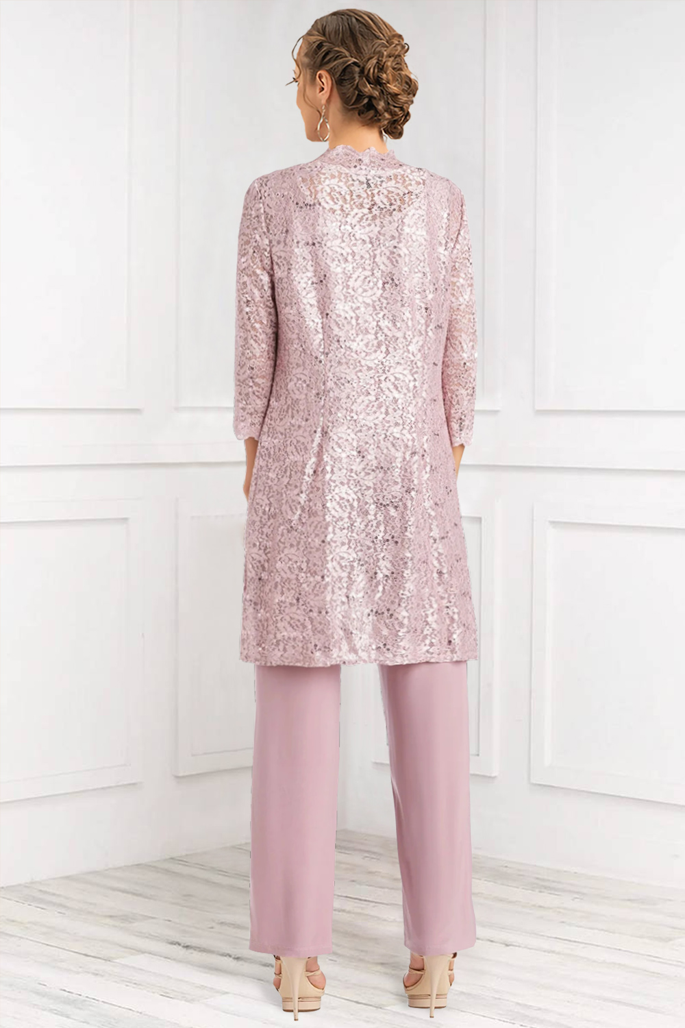 • Plus Size Mother Of The Bride Pink Lace 3/4 Sleeve Curved Cuff Jacket Three Piece Pant Suits
