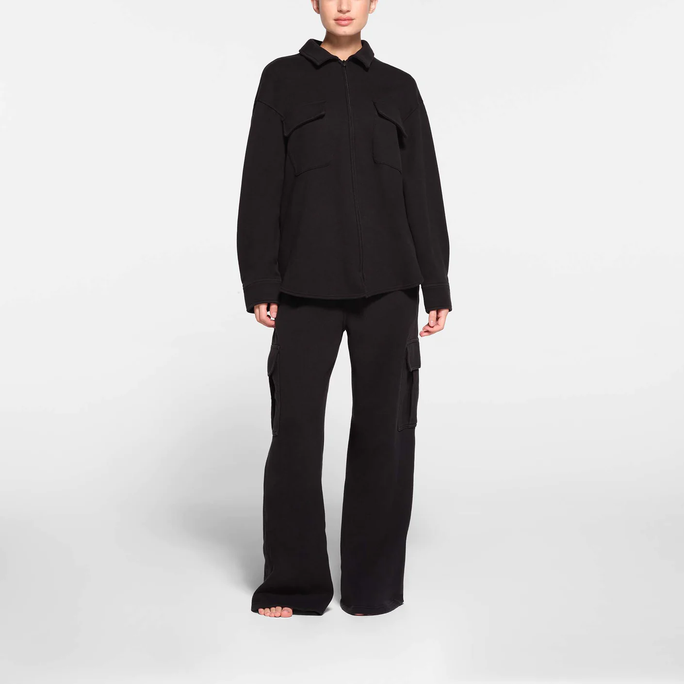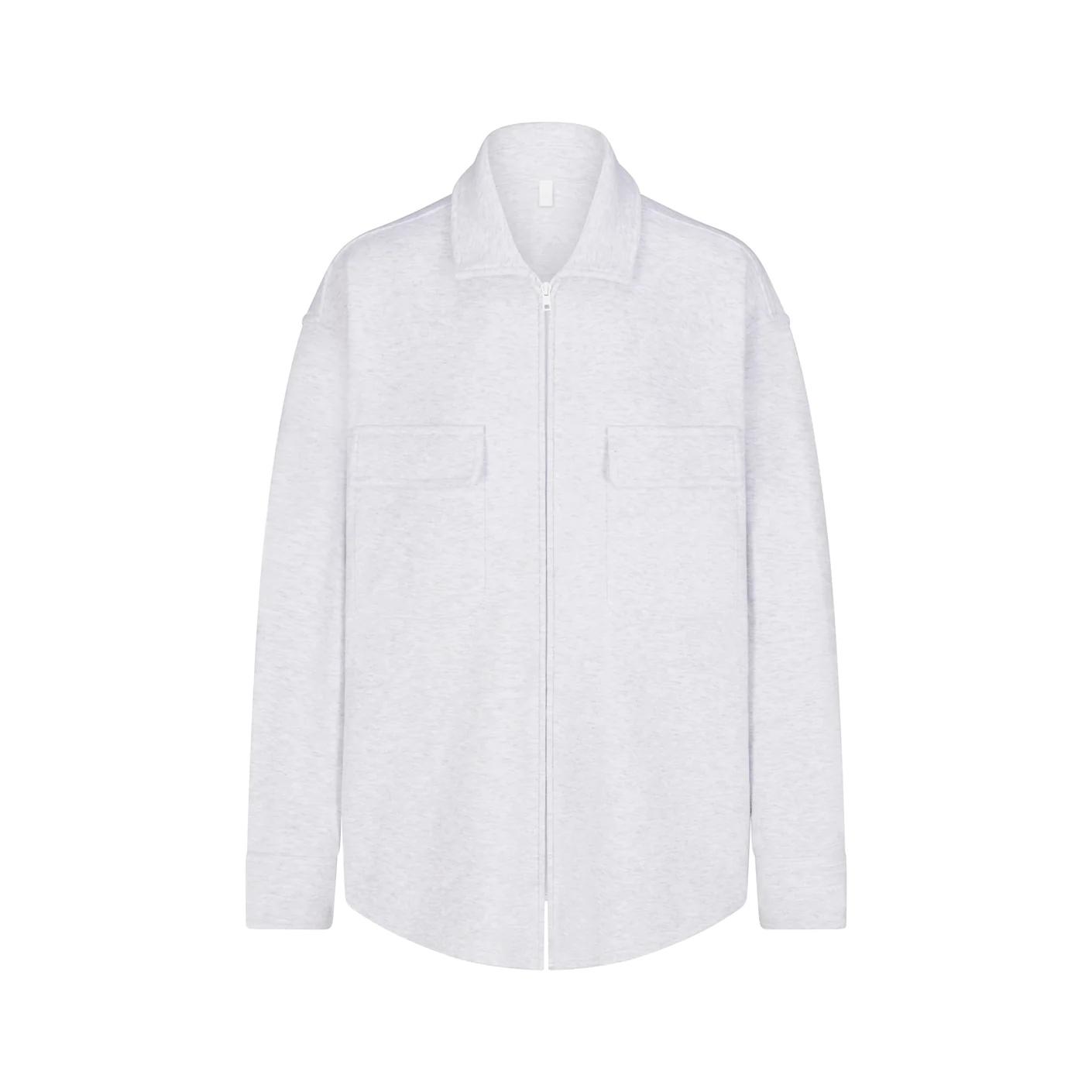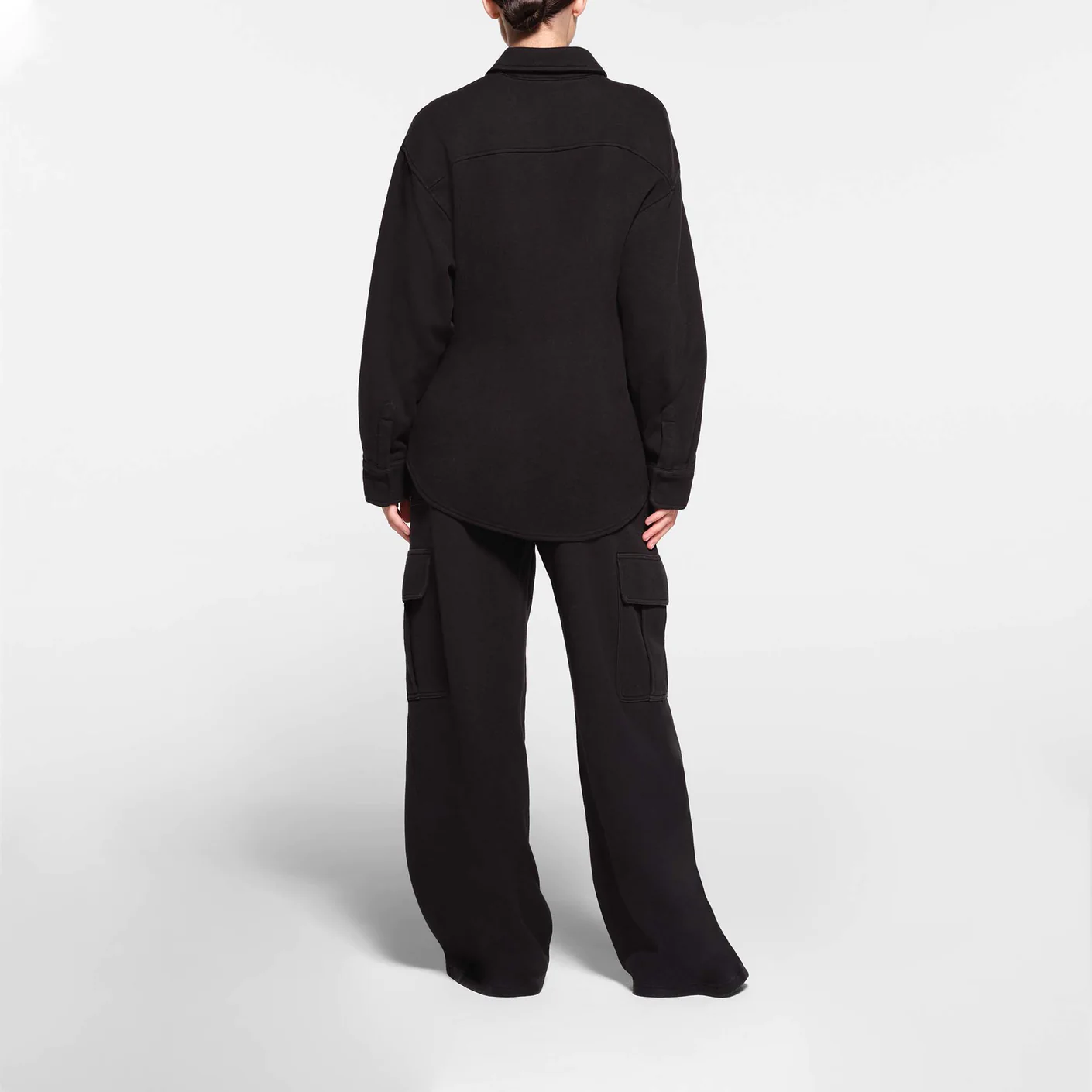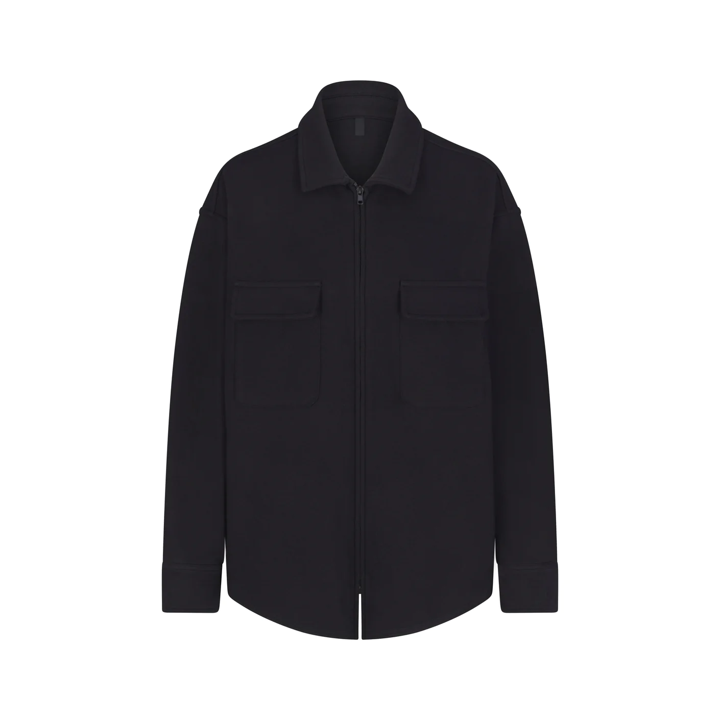 At-home comfort meets wear-everywhere style. This plush utility jacket features chest pockets on both sides of the front zipper for a cool, off-duty look. Features interior snap buttons at the sleeve cuffs. Fits true to size for an oversized fit.