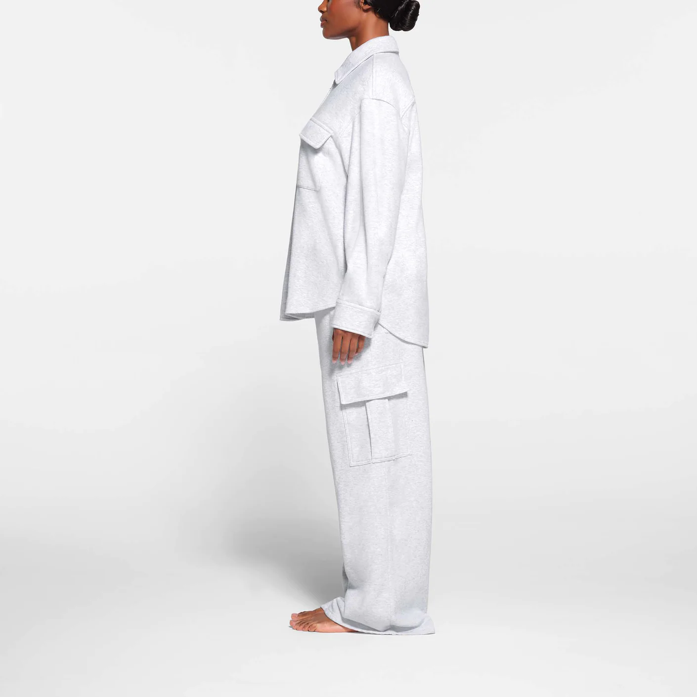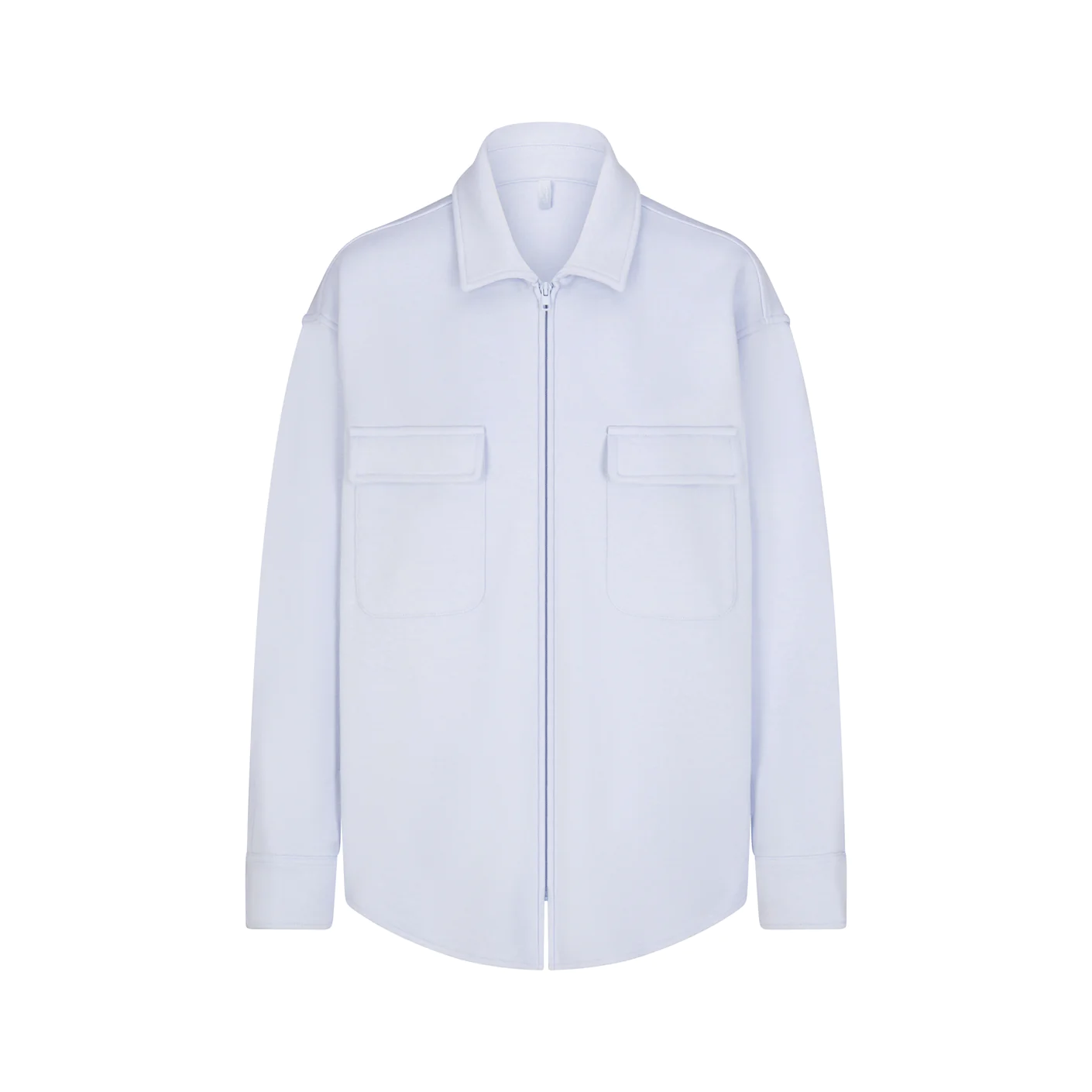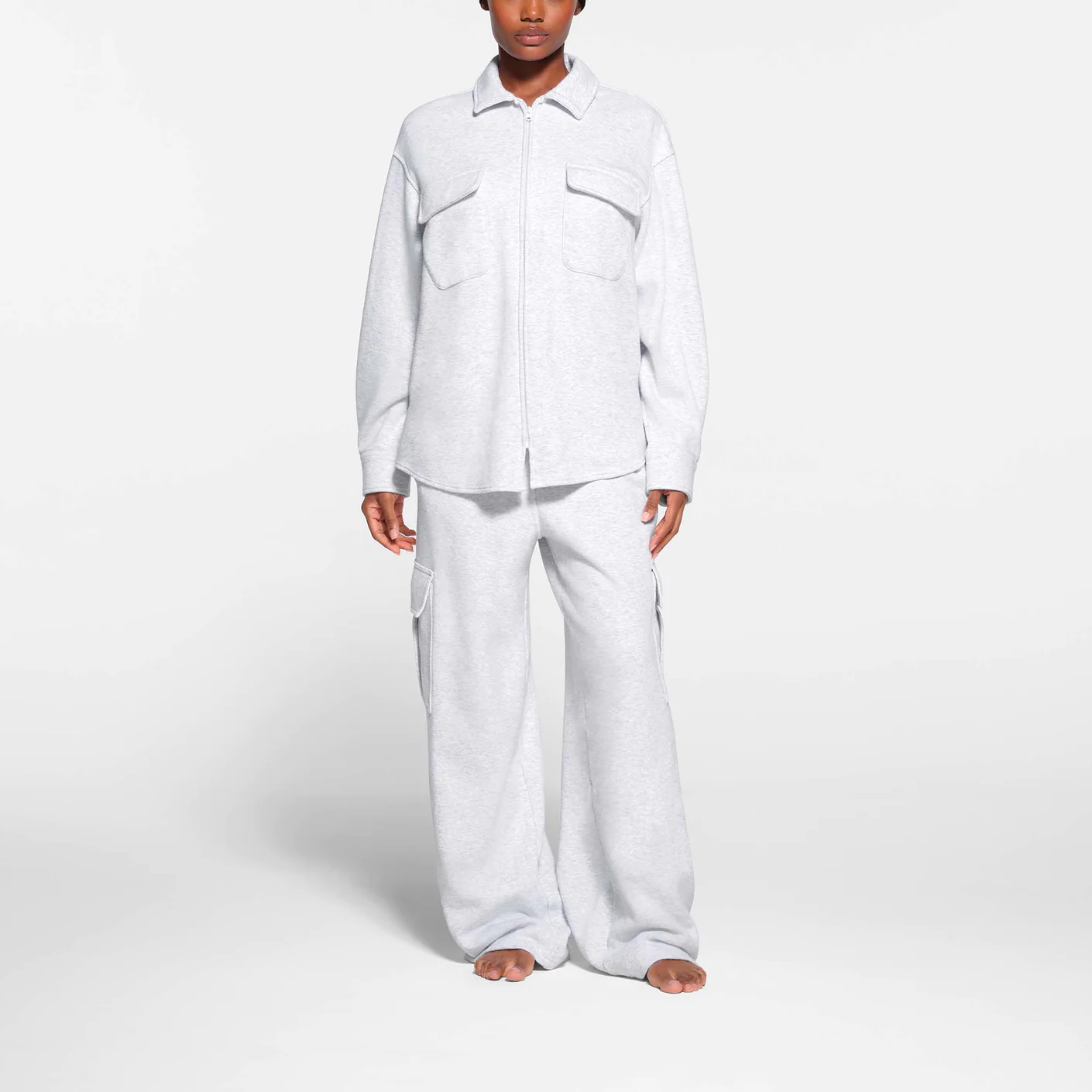 At-home comfort meets wear-everywhere style. This plush utility jacket features chest pockets on both sides of the front zipper for a cool, off-duty look. Features interior snap buttons at the sleeve cuffs. Fits true to size for an oversized fit.