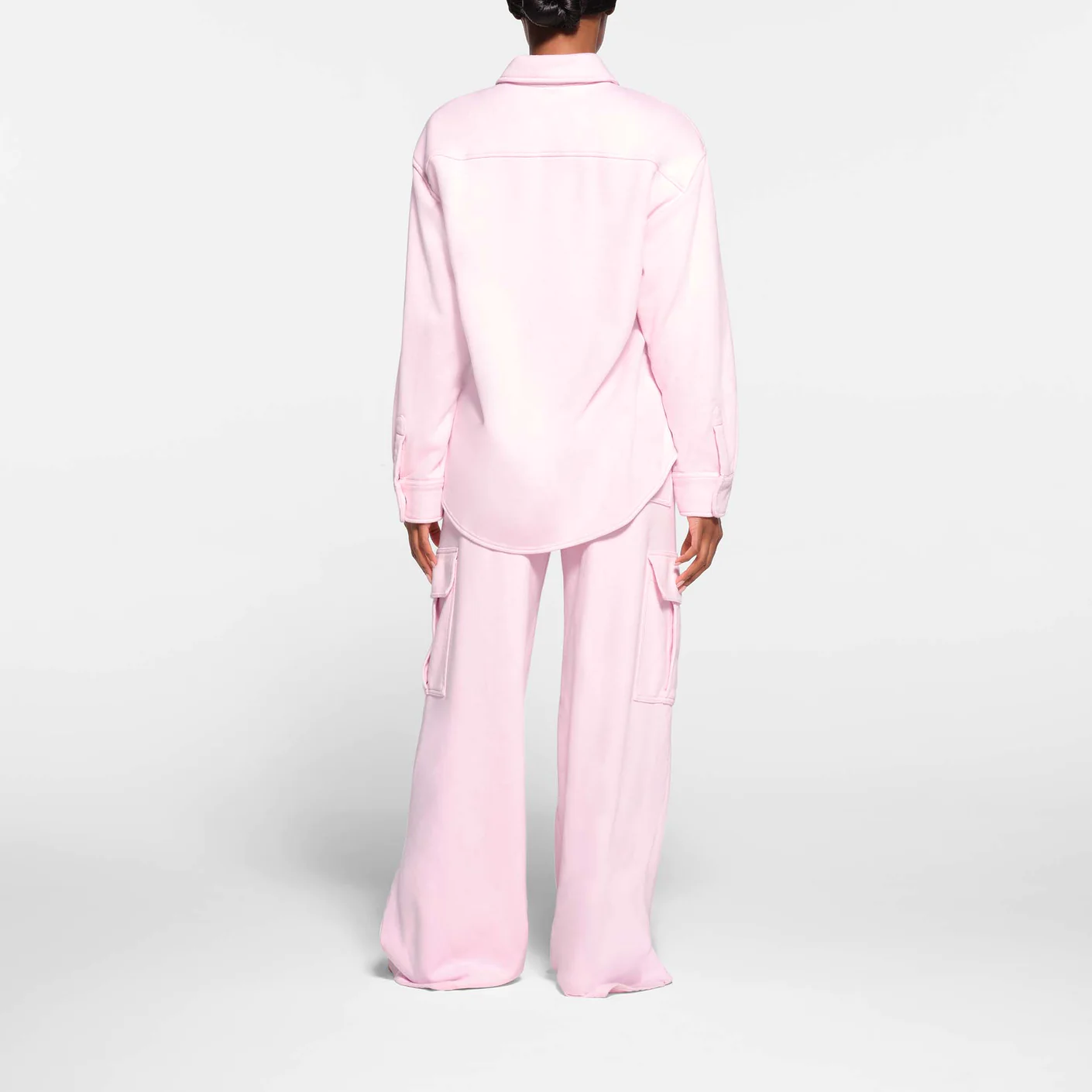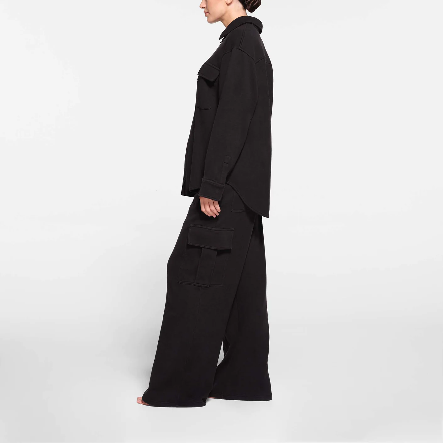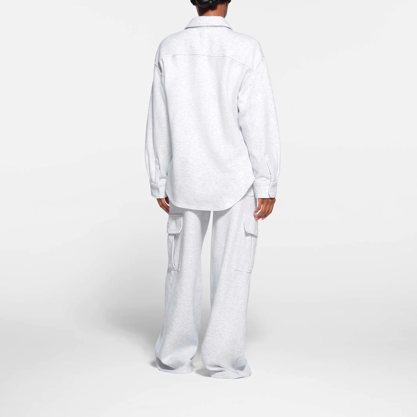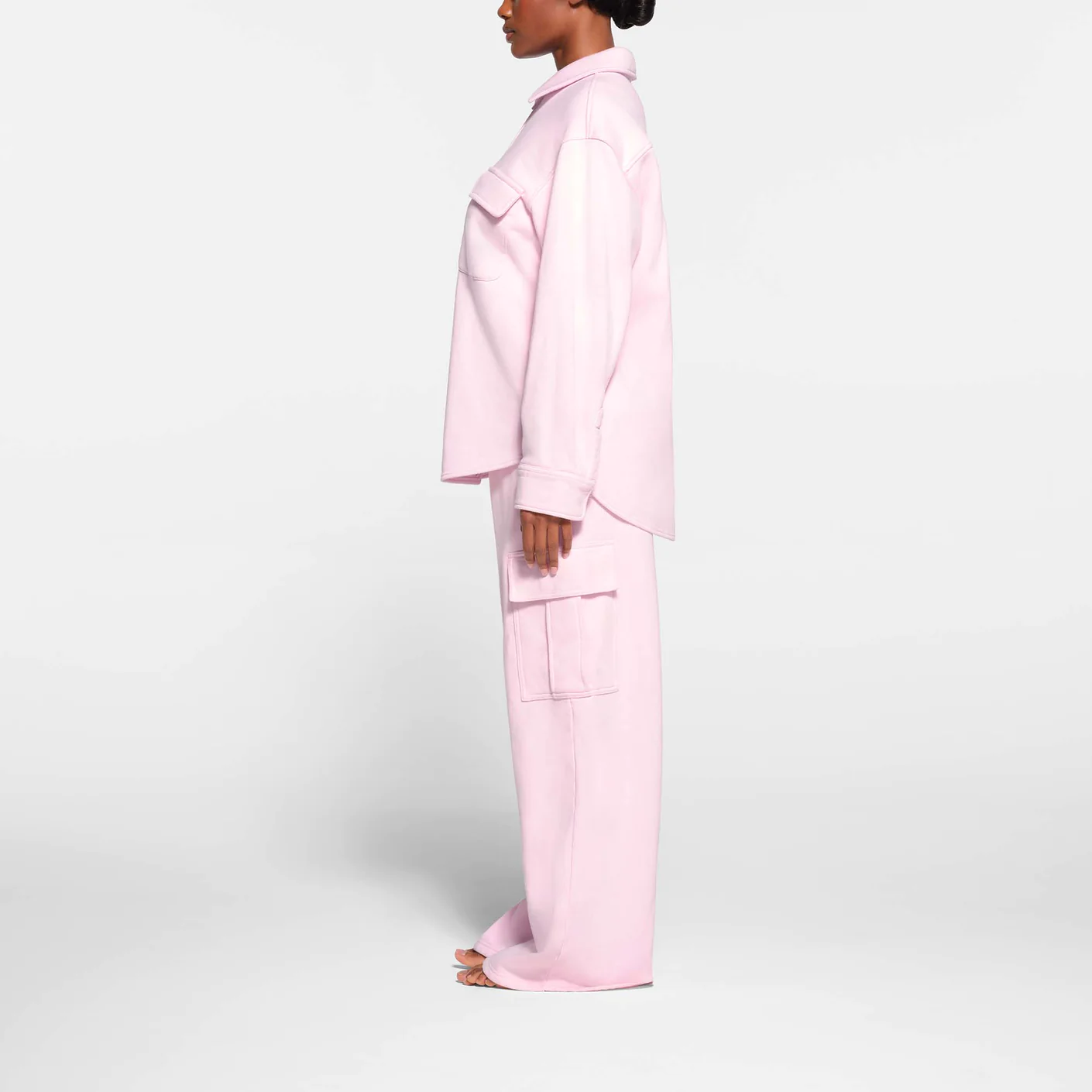 At-home comfort meets wear-everywhere style. This plush utility jacket features chest pockets on both sides of the front zipper for a cool, off-duty look. Features interior snap buttons at the sleeve cuffs. Fits true to size for an oversized fit.